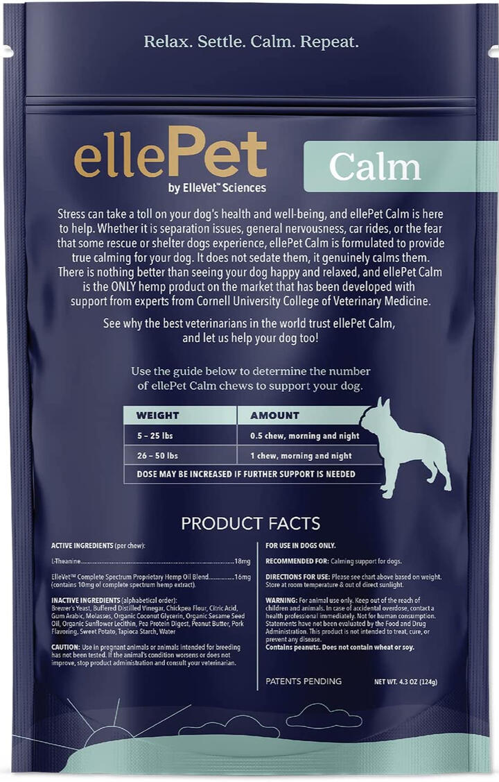 Calming support for dogs experiencing stress, helping them feel calm and relaxed. Chronic stress can affect a dog's well-being and quality of life. Whether it's separation anxiety, general nervousness, or fear of car rides, ElleCalm is formulated to provide true relaxation without sedation. ElleCalm is uniquely developed with support from experts at Cornell University College of Veterinary Medicine. Backed by science with multiple successful clinical trials.